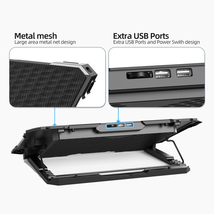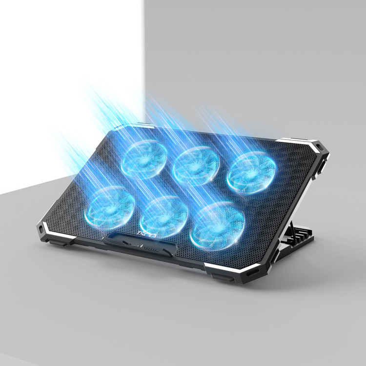 کول پد تسکو مدل TCLP 3119 از ترکیب پلاستیک و مش آهنی ساخته شده است. به همین خاطر یک مدل سبک، شیک و البته قوی است. روی مش این لپتاپ به تنفس بهتر لپتاپ کمک شایانی میکند. TCLP 3119 در ابعاد 420x290x31 میلیمتر طراحی شده و رنگ مشکی این کول پد ظاهری شیک و رسمی به آن میدهد. وزن سبکی دارد و حدوداً 800 گرم است. همچنین این کول پد مجهز به 12 LED است که نورپردازی rgb زیبایی به هنگام استفاده نمایش میدهد. مشخصات فنی کول پد تسکو مدل TCLP 3119 کول پد تسکو مدل TCLP 3119 برای لپتاپهای 15.6 اینچی مناسب است. در طراحی این کول پد از 6 فن با ابعاد 70x15 میلیمتر استفاده شده است. این 6 فن قدرتمند با سرعتی حدود 2500+/-10% RPM دور بر دقیقه میچرخند. این چرخش جریان هوای بسیار مطلوبی ایجاد میکند و بهسرعت دمای لپتاپ را پایین میآورد. شما بهراحتی میتوانید این کول پد را با دکمه ON/OFF دستگاه، خاموش و روشن کنید. در پشت این کول پد دو پورت USB قرار داده شده است. یکی از این پورتها برای جبران پورتی که کول پد از لپتاپ اشغال میکند و دیگری یک پورت اضافه است تا بتوانید هر دستگاهی را که مد نظرتان است به لپتاپ متصل کنید. اگر به پشت این فن دقت کنید، علاوه بر پورتهای USB یاد شده، یک جفتپایه نیز میبینید. پایههای تنظیم ارتفاع این کول پد برای تنظیم زاویه استفاده راحتتر از لپتاپ تعبیه شدهاند. به همراه این کول پد یک کابل PC نیز به شما ارائه میشود.