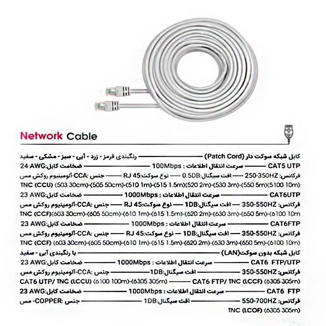 نوع سوکت : UTP پلاستیکی سرعت انتقال اطلاعات : 100Mbps افت سیگنال : 0.5DB فرکانس : 250-350HZ جنس : CCA (آلومینیوم با روکش مس)