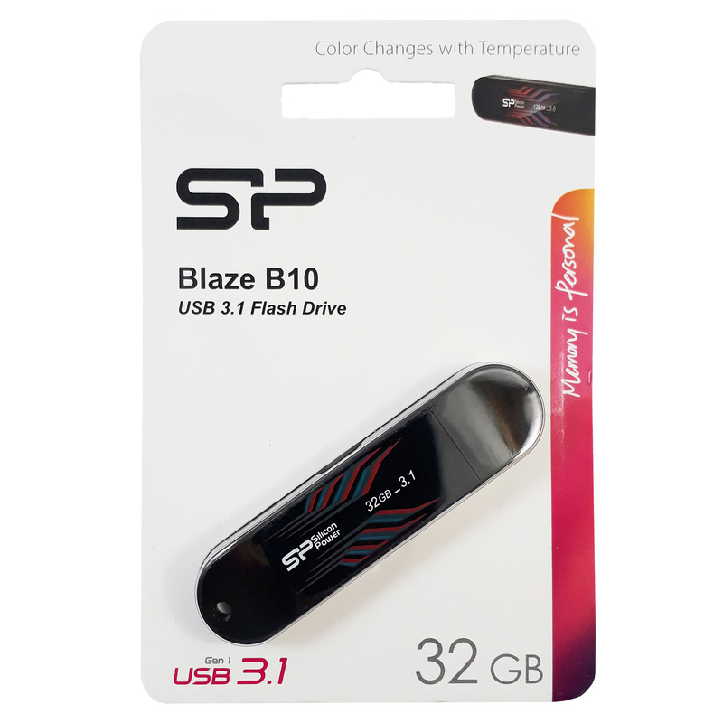 رابط این مدل فلش مموری از نوع USB 3.1 بوده و از رابط های قدیمی تر USB 1.1 , USB 2.0 و USB 3.0 هم پشتیبانی می کند, در نگاه اول این فلش مموری به سایر USBها شباهت بسیاری دارد با این تفاوت که طراحی جذابی بر روی بدنه آن به چشم میخورد. اما به محض این که نگاه دقیقتری به این محصول بیندازید متوجه میشوید که تمایز اصلی این فلش مموری در همین طراحی جذاب است، در واقع سیلیکون پاور در طراحی ظاهری این درایو از جوهر حرارتی استفاده کرده است که شرایط کاری آن را به شما نمایش میدهد. به طور دقیقتر، وقتی این فلش به سیستم متصل نیست یا در سیستم از آن استفاده نمیکنید، طرح روی بدنه فلش به رنگ آبی دیده میشود، اما وقتی از این فلش استفاده میکنید و آن را تحت فشار مداوم قرار میدهید، طرح روی بدنه فلش با افزایش دمای آن (به طور دقیقتر وقتی دمای آن به بیش از 31 درجه سانتیگراد میرسد) به تدریج به قرمز تغییر رنگ میدهد. البته شاید این ویژگی کاربرد خاصی نداشته باشد، اما بدون تردید در متمایز کردن Blaze B10 از سایر رقبایش کاملاً موفق بوده است.ضمنا در بدنه این فلش مموری یک نشانگر LED قرار دارد تا وضعیت انتقال اطلاعات و عملکرد فلش مموری را به شما نمایش دهد. قسمت بالا و پایین B10 اندکی مخروطی شکل بوده و یک حلقه در قسمت بالای آن تعبیه شده است که میتوان آن را به جا کلیدی آویزان کرد. در مجموع میتوان گفت در حالی که Blaze B10 یک محصول جذاب و متفاوت بوده، عملکرد قابل قبولی را هم ارائه داده است.