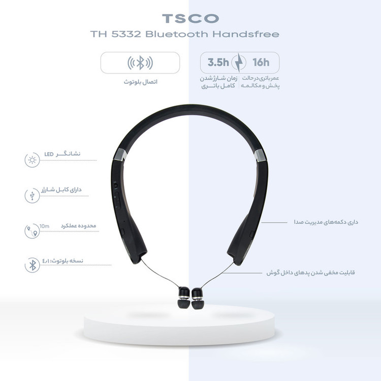 هدفون «تسکو» (Tsco) مدل «TH 5332» محصولی با طراحی منحصربهفرد از این برند است. بند این هدفون دور گردن قرار میگیرد و پدهای داخل گوشی به صورت مخفی داخل آن قرار دارند که موقع استفاده میتوانید آنها را بیرون بیاورید. این طراحی، راحتی بسیار بیشتری را فراهم میکند و باعث میشود از افتادن هدفون جلوگیری شود. وزن آن 67 گرم و بسیار سبک است و هیچ فشاری به گردنتان وارد نمیکند. این مدل بهواسطهی بلوتوث نسخهی 4.1 به موبایل یا تبلت متصل میشود. این هدفون مجهز به میکروفون داخلی است و کاربران میتوانند با آن به مکالمه بپردازند. محدودهی عملکرد آن ده متر است. این امر به این معناست که پس از هماهنگکردن هدفون با موبایل، میتوانید از آن تا ده متر فاصله بگیرید و همچنان به موسیقی گوش کنید یا به مکالمه ادامه دهید. این مدل دارای یک عدد باتری داخلی است که از کیفیت ساخت بالایی بهره میبرد. این باتری در مدت 3.5 ساعت به طور کامل شارژ میشود. میتوانید با استفاده از این هدفون 16 ساعت مکالمه کنید یا 18 ساعت به موسیقی گوش دهید. برای کنترل سطح صدا و مکالمه، روی بند دور گردنی آن، چند دکمه تعبیه شده است که استفاده از این هدفون را بسیار راحتتر کرده است. درمجموع با تهیهی این هدفون، صاحب محصولی خوشساخت خواهید شد که تا مدتهای طولانی کارایی بسیار خوبی ارائه میکند.