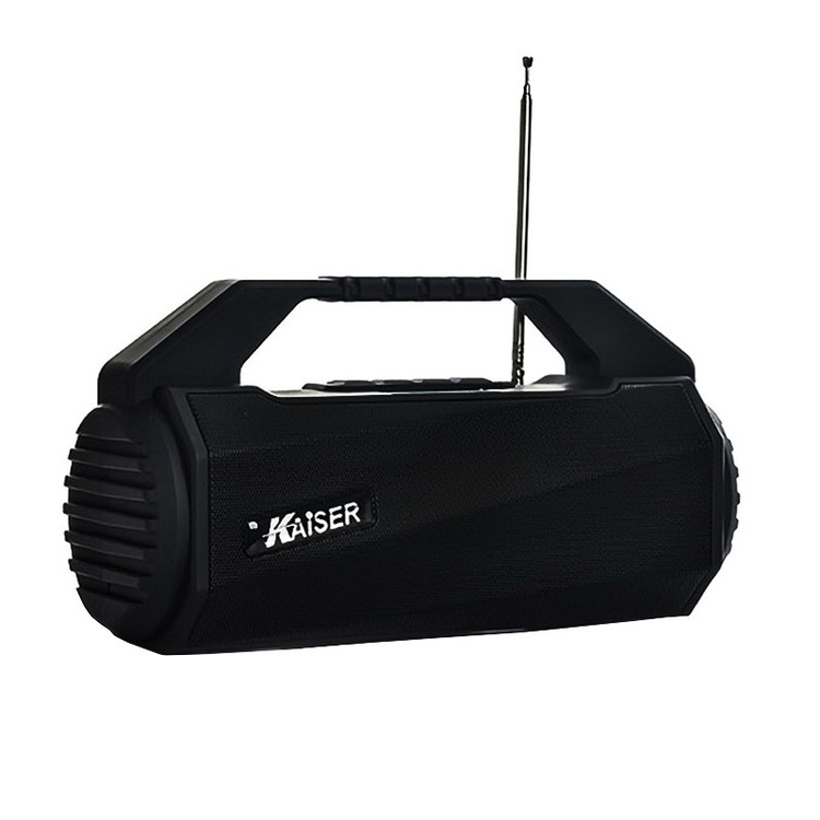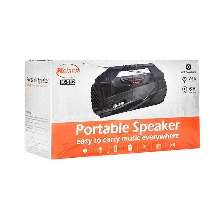 اسپیکر بلوتوثی رم و فلش خور کایزر مدل K-512 از محصولات شرکت KAISER می باشد که به طور بیسیم و از طریق بلوتوث ورژن 5.0 به گوشی موبایل، تبلت و یا هر وسیله دیگری می تواند متصل شود. این اسپیکر انرژی خود را از طریق باتری داخلی با توان 1200 Mph تامین کرده و به خاطر داشتن ابعاد مناسب آن را به راحتی می توانید با خود حمل کنید. اسپیکر کایزر مدل K-512 از درگاه ورودی فلش مموری، کارت میکرو اس دی و همینطور AUX نیز برخوردار است. کایزر K-512 مجهز به صفحه نمایش LED جهت اطلاع از عملکرد محصول و همچنین مجهز به تکنولوژی TWS نیز می باشد.