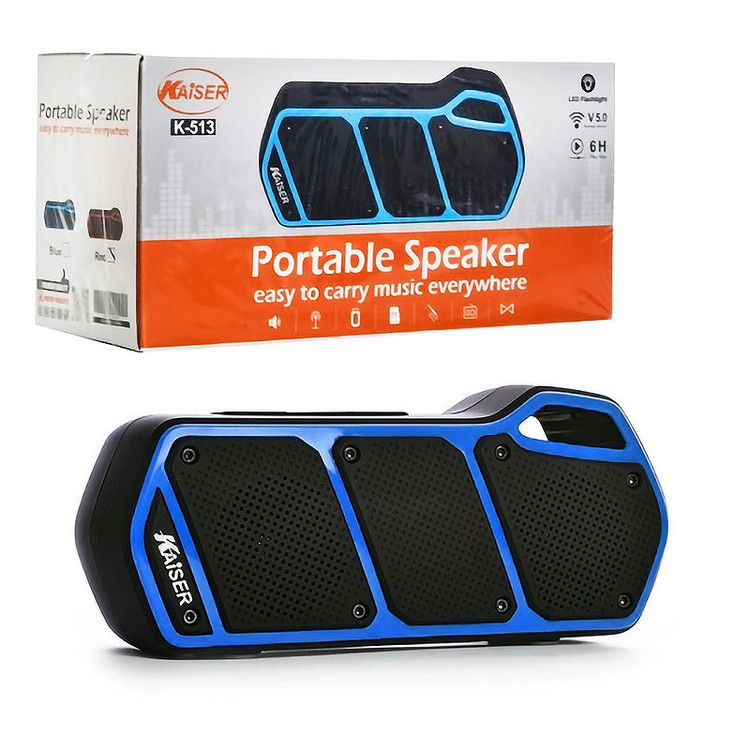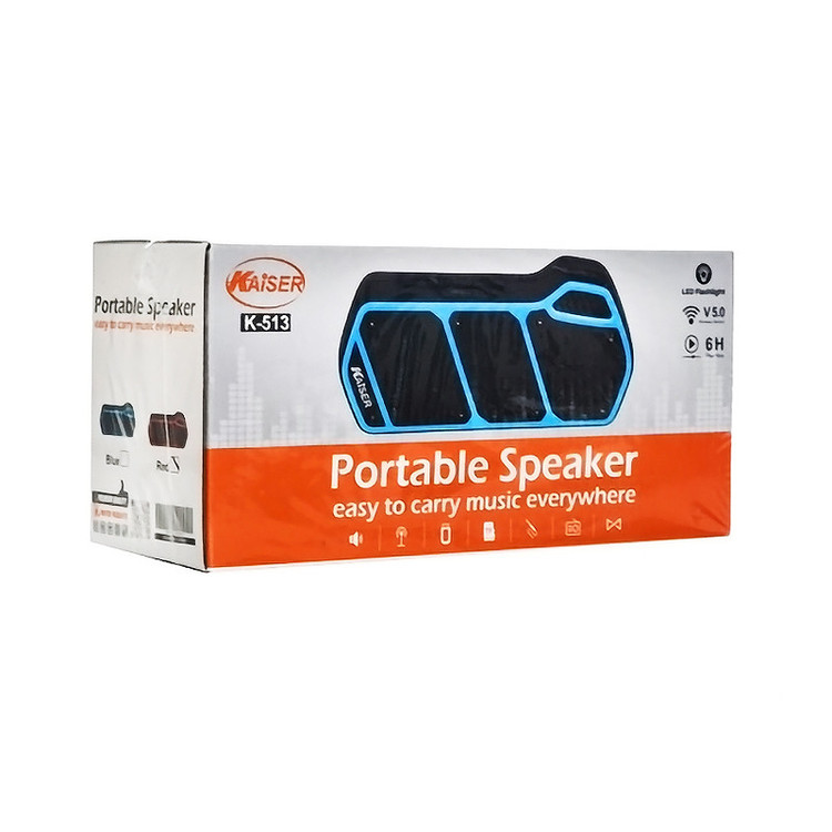 اسپیکر بلوتوثی رم و فلش خور برند کایزر به صورت وایرلس و به وسیله بلوتوث ورژن 5.0 به گوشی موبایل، تبلت و یا هر وسیله دیگری می تواند متصل شود. این اسپیکر انرژی خود را از راه باتری داخلی و با توان 1200 میلی آمپر ساعت تامین کرده و می توان آن را در طبیعت، مسافرت و هر مکانی با خود حمل کرده و در جمع دوستان استفاده نمایید. این اسپیکر از درگاه ورودی فلش، کارت میکرو اس دی و همچنین AUX نیز برخوردار است. این اسپیکر دارای تکنولوژی TWS بوده و می تواند به صورت همزمان به اسپیکر دیگری نیز متصل شود.