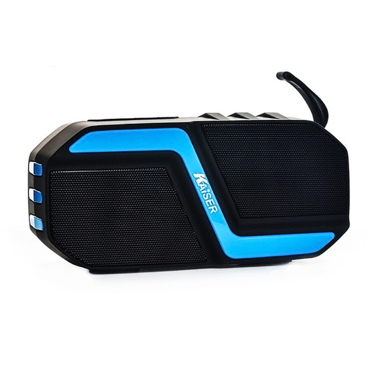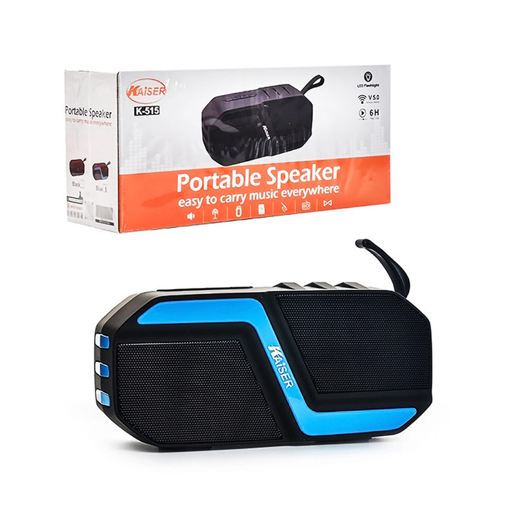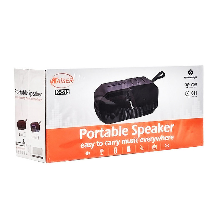 اسپیکر بلوتوثی رم و فلش خور کایزر مدل K-515 یک محصول بسیار با کیفیت بوده که به صورت بیسیم و از طریق بلوتوث نسخه 5.0 می تواند به گوشی موبایل، تبلت و یا هر وسیله دیگری اتصال پیدا کنید. این اسپیکر انرژی خود را از طریق باتری داخلی با توان 1200 میلی آمپر ساعت تامین کرده و می توانید از آن در طبیعت و جمع دوستان به راحتی استفاده کنید. اسپیکر کایزر مدل K-515 دارای درگاه ورودی فلش، کارت میکرو اس دی و همچنین AUX نیز می باشد. این محصول با داشتن فناوری TWS می تواند به صورت همزمان به یک اسپیکر دیگر نیز متصل شود. کایزر K-515 مجهز به نورپردازی نیز می باشد.