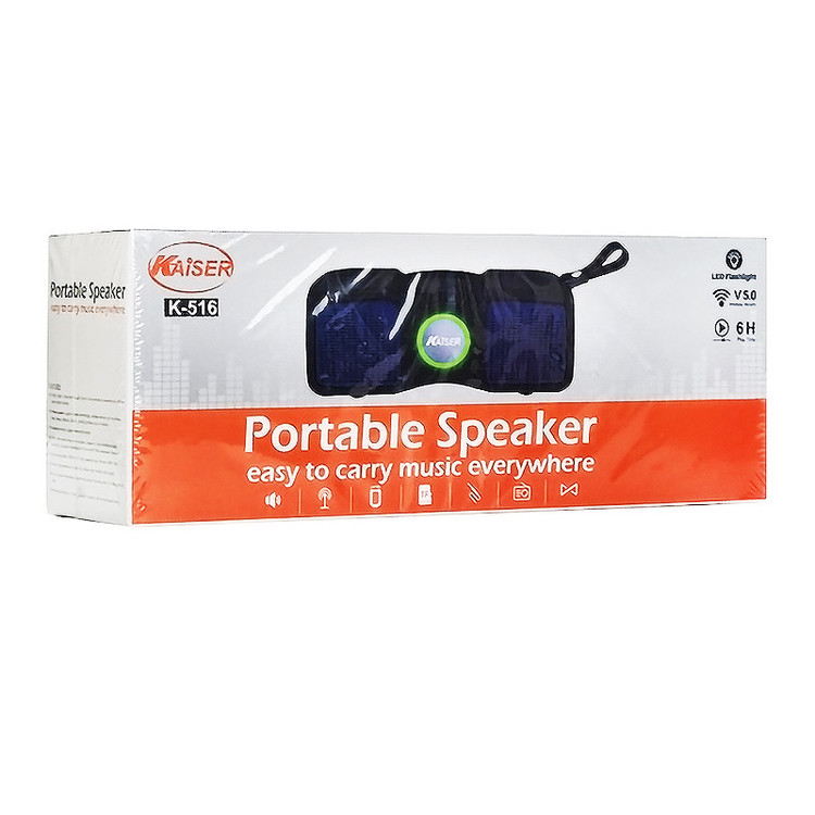 نحوه اتصال این اسپیکر کایزر به صورت بیسیم با رابط اتصال بلوتوث نسخه 5.0 با برد بیسیم 10 متر بوده و مجهز به درگاه فلش مموری، کارت حافظه، ورودی AUX، برخورداری از رادیو موج FM می باشد. همچنین تامین انرژی اسپیکر توسط باتری داخلی با ظرفیت 1200 میلی آمپر ساعت بوده و ابعاد جمع و جور آن حمل آسان را برای شما ممکن می کند. مجهز به تکنولوژی TWS به منظور اتصال دو اسپیکر به صورت همزمان از ویژگی های خاص این محصول می باشد.