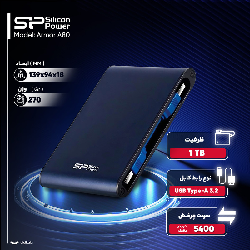 شرکت «سیلیکون پاور» (Silicon Power) این سری از هارددیسکهای اکسترنال خود را با نام آرمور (Armor) به معنای زره یا ضدگلوله به بازار ارائه کرده است. البته این نامگذاری بیدلیل نبوده، زیرا این سری از هارددیسکها که A80 هم عضو آنهاست، در برابر آب، ضربه، گرد و خاک، فشار و لرزش مقاوم هستند و این خاصیتها در آزمایشهای مختلف سیلیکونپاور به اثبات رسیده است. نام انتخابشده برای این سری از هارددیسکها هم به همین دلیل است. این هارددیسک اکسترنال 1ترابایتی از رابط پرسرعت USB 3.0 (USB 3.2 Gen 1) بهره میبرد و در عین حال با رابطهای قدیمیتر مانند USB 2.0 نیز سازگار است. هارددیسک A80 انرژی مورد نیاز خود را نیز از همین رابط USB تامین میکند و این کار را به صورت همزمان در حال تبادل اطلاعات انجام میدهد. این هارددیسک برای افرادی که بیشتر زمان خود را در حال حرکت هستند و یا افرادی که میخواهند اطلاعات مهم خود را همیشه همراه داشته باشند و نمیخواهند نگران ازبینرفتن اطلاعات بر اثر آسیب و خطرات ناگهانی باشند، بسیار مناسب است.